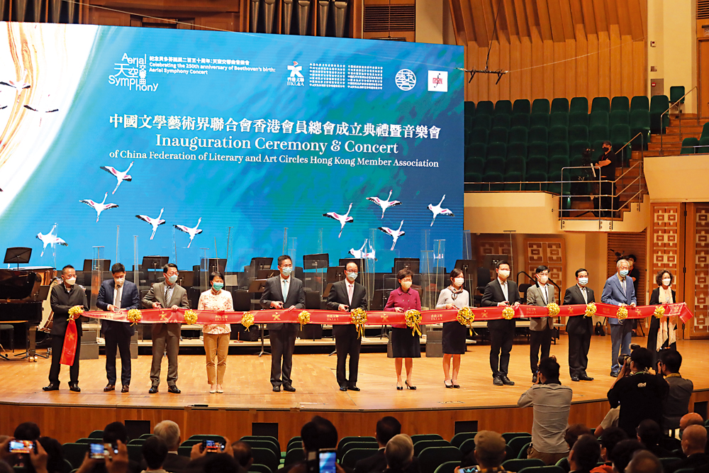 中國文學藝術界聯合會香港會員總會(下稱:香港文聯)昨晚在香港文化中心音樂廳舉辦成立典禮暨音樂會。香港特別行政區行政長官林鄭月娥,中聯辦副主任盧新寧,特區政府民政事務局局長徐英偉,商務及經濟發展局署理局長陳百里,立法會議員、中國文聯香港會員總會會長馬逢國等出席活動並共同主禮,約千位香港文藝界代表到場參加。\大公報記者 徐小惠 李亞清(文) 馬丁(圖)
