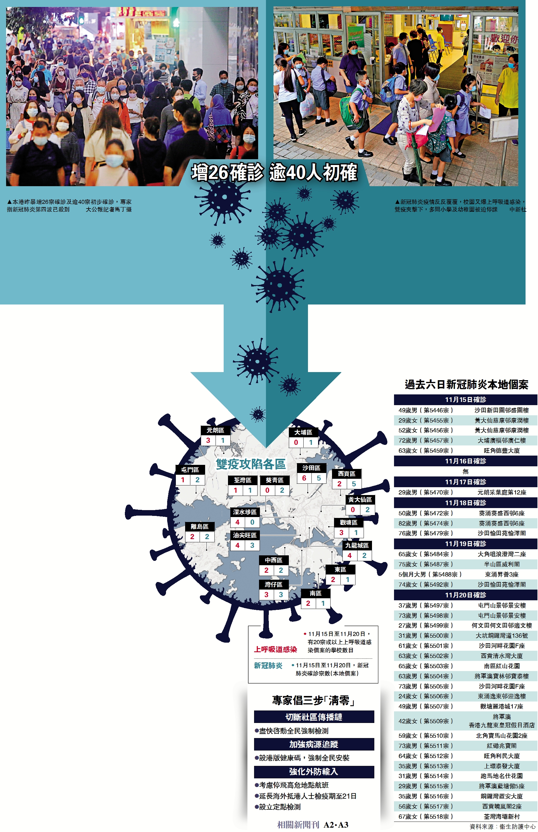 新冠肺炎第四波疫情殺到,本港昨日新增26宗確診個案,包括21宗本地個案;另有逾40人初步確診,創8月18日以來新高。新冠疫情加上校園爆發上呼吸道感染,專家警告,全民強制檢測刻不容緩,強調防疫成功必須環環相扣,建議政府應同時考慮強制所有人安裝「安心出行」、設立定點檢疫;亦有專家建議,政府應考慮停飛高危地點航班,或延長海外抵港人士檢疫期至21日。建制派立法會議員昨日會見特首亦要求,政府須推行全民強制檢測,令香港盡快擺脫疫情困局。