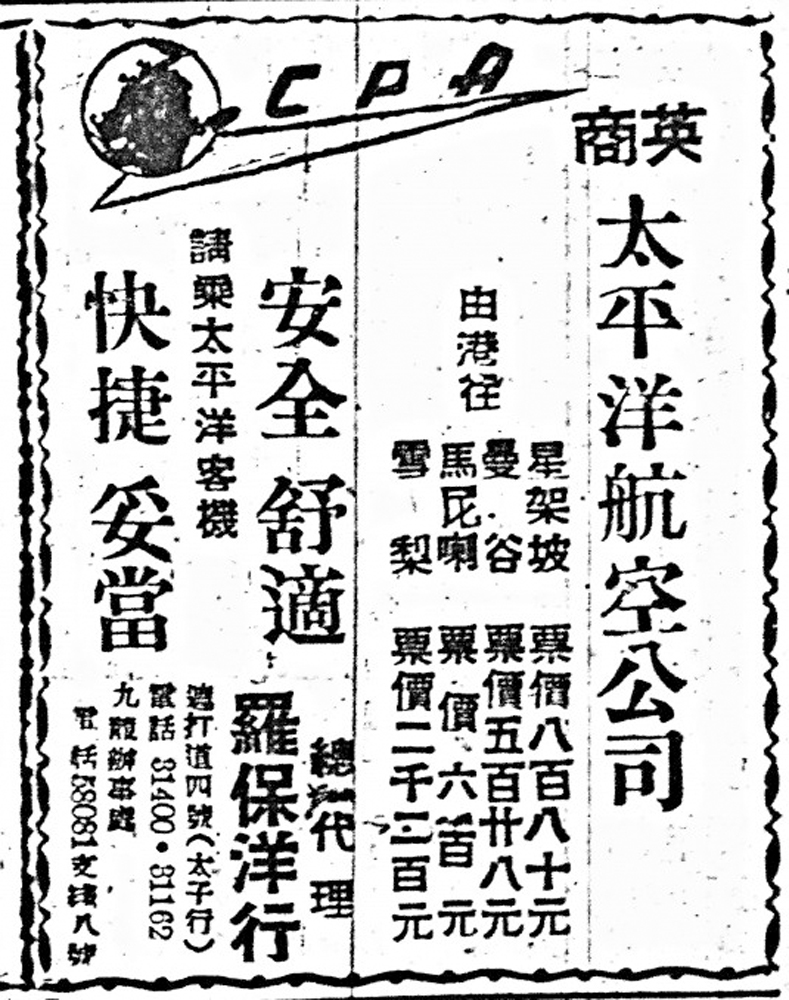這則廣告的宣傳口號是:「安全舒適 快捷妥當 請乘太平洋客機」英商太平洋?大家對這名字很陌生吧,左上角的英文簡稱告訴大家一個小秘密,「CPA」即「Cathay Pacific Airways」,就是現在大家熟悉的國泰航空。一九四六年,一個美國人及一個澳洲人原本在內地做飛機生意,他們從上海的龍華機場駕着飛機偷偷飛來香港,成立了「Cathay Pacific Airways」。「Cathay」是中世紀歐洲人對中國的古稱呼,即契丹。但創辦者當中完全沒有英國人,為什麼會叫英商?吳邦謀解釋,「當時啲人英文水平不是太高,飛機是好新的事物,做翻譯的人不清楚這間公司的背景,由於香港是英國殖民地,見到是外國人就說是英國人公司,所以就叫英商太平洋。」