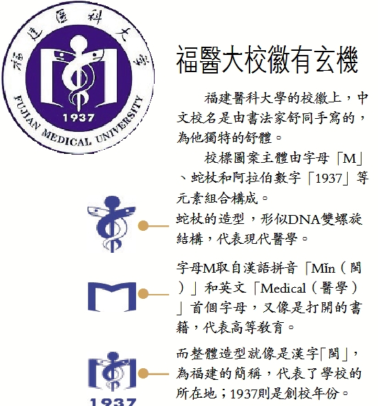 字母M取自漢語拼音「Mǐn(閩)」和英文「Medical(醫學)」首個字母,又像是打開的書籍,代表高等教育。