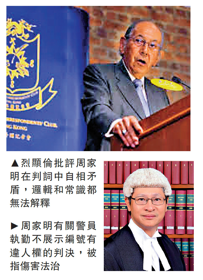 烈顯倫在《星島日報》撰文指出,周家明在六十六頁的判決書中,最後結論沒有作出任何實質性裁決,只是宣告兩個觀點。針對周家明稱警方現有執法方式的錯誤,在於未能突出顯示警員編號或標記,烈顯倫質疑,「突出顯示」的意思,是要在光天化日之下看清楚,還是在黑暗中也要看得清清楚楚?他批評周家明在判詞中自相矛盾,既在判詞中已認可警隊已建立了「在必要或需要時可以追查個別警官」的系統,但最後卻又得出有關觀點,「邏輯和常識都無法解釋。」