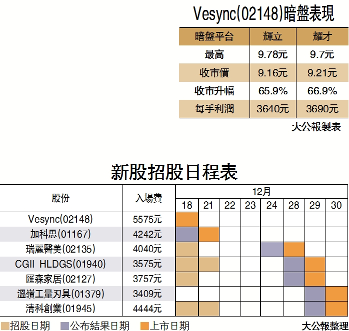 至於昨日掛牌的兩隻新股則個別發展,輝立暗盤交易僅升0.4%的云想科技(02131),首日表現不俗,最高曾升38.68%至9.68元,其後升幅收窄,收報8.12元,升幅仍達16.3%,每手1000股不計手續費賺1140元。云想科技於公開發售部分獲約16萬份認購,超額認購113.45倍,集資額約13億元。
