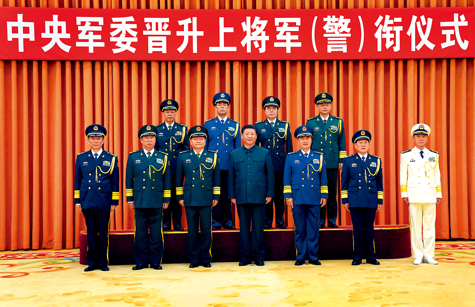 晉銜儀式在嘹亮的軍歌聲中結束。隨後,習近平等領導同志同晉升上將軍銜警銜的軍官警官合影。