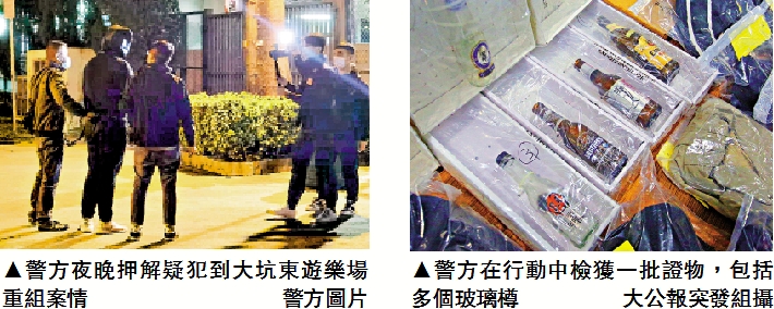 另警方在拘捕行動中,在旺角一幢「三無大廈」的天台檢獲包括電油、泵及空啤酒樽等製造汽油彈的原材料,同時在被捕者住所檢獲相信是犯案時的衣履及鞋襪。三名被捕者將以縱火罪被落案起訴,並於今日提堂。