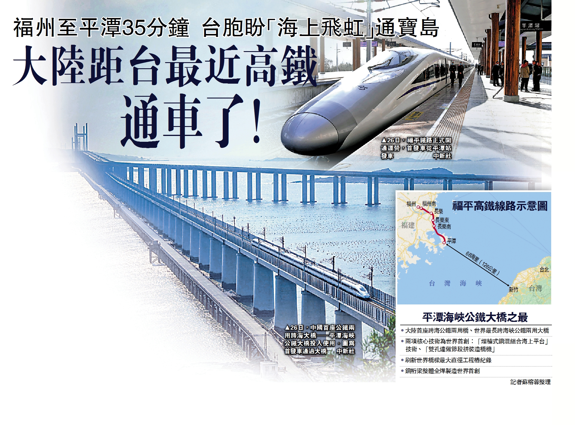 兩岸共同家園建設迎來「加速度」。26日上午,隨着G5322次列車從平潭站緩緩駛出,祖國大陸離台灣島最近的鐵路─福(州)平(潭)高鐵正式開通運營。中國首座公鐵兩用跨海大橋─平潭海峽公鐵大橋同步投入使用,福州至平潭間最快35分鐘可達。多名在平潭投資創業的台胞登上首發列車,體驗有「海上飛虹」美譽的福平高鐵。在讚嘆之餘,他們期待未來台灣海峽通道建設提上日程,早日坐上從平潭直達台灣的高鐵。\大公報記者 蘇榕蓉福州報道