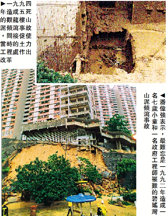 回顧37年公務生涯,潘偉強最難忘是1992年造成一名七歲小童和一名政府工程師罹難的碧瑤灣山泥傾瀉事故,他當時有份參與調查工作,並展開了他逾30年的防治山泥傾瀉工作。他形容事故標誌了往後數年「黑暗時期」的開始,而1994年造成五死的觀龍樓山泥傾瀉事故,則間接促使當時的土力工程處作出改革,投放更多資源改進斜坡安全工作。