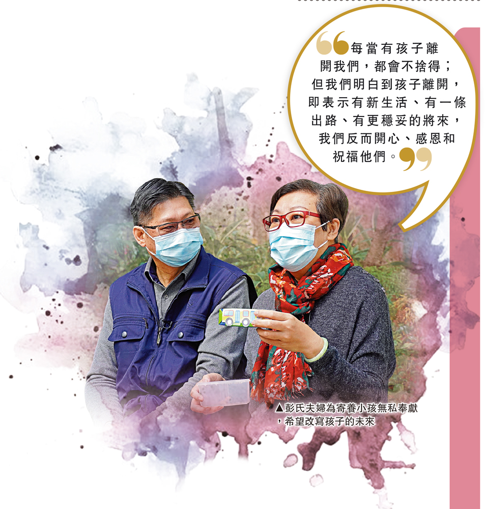 至於彭氏夫婦用心照顧沒血緣的孩子,家裏的兩名兒子有沒有呷醋?彭太表示,由於自小已告訴兩兒,有些孩子家裏有困難,需要暫住他們家,幫忙照顧小朋友,而他們反正有小朋友和他們玩,完全沒有呷醋。