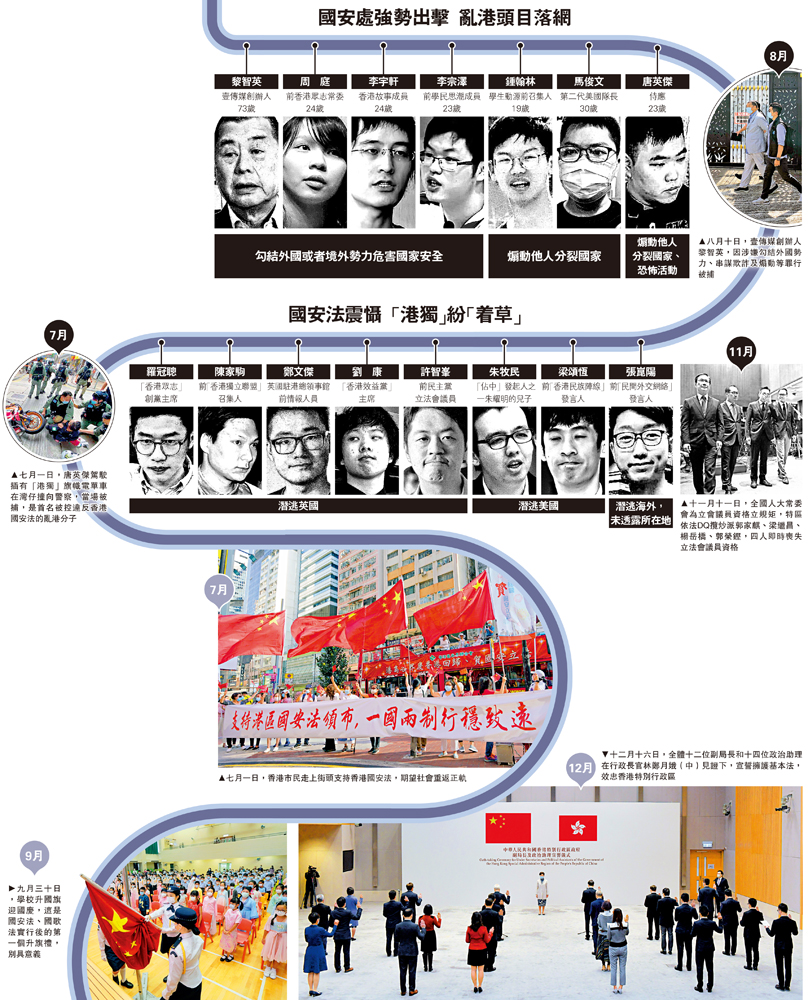 2020年,我們一起走過不平凡的一年。香港國安法頒布實施半年以來,市民不再因黑暴擔驚受怕。全國人大常委會就香港特區立法會議員資格問題作出決定,特區政府要求公務員宣誓或簽署聲明擁護基本法、效忠香港特區,確保「愛國者治港」。播「獨」教師被除牌、通識科展開改革,教育邁出了正本清源的重要一步。2020年,香港全面開啟由亂向治的新局面。」大公報記者 龔學鳴