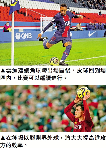 雲加認為,目前擲界外球一方,場上只有九人(不計門將),防守方有十人較難快速進攻,若容許獲界外球一方,在己方半場以腳代手開界外球更為合理。不過,他未詳細交代,處理界外球是劃一規定用腳,還是「可手可腳」,相信其建議要落實也需進一步討論。