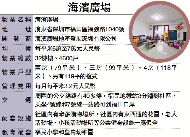 深圳中原地產福田南區總經理馬創渤表示,皇崗片區的海濱廣場有20棟高樓,包括福安閣、福星閣和福長閣等。大戶型均價低至六、七萬元(人民幣,下同),周邊配套齊全,皇崗片區和福田區內,為低價筍盤,極具升值潛力。