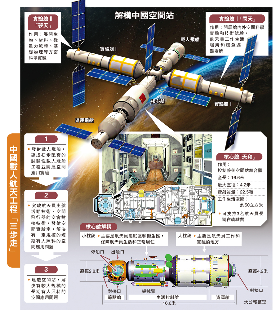 按照計劃,中國空間站將先後發射「天和」核心艙、「問天」實驗艙和「夢天」實驗艙,進行空間站基本構型在軌組裝建造;其間,規劃發射4艘神舟載人飛船和4艘天舟貨運飛船,進行航天員乘組輪換和貨物補給。