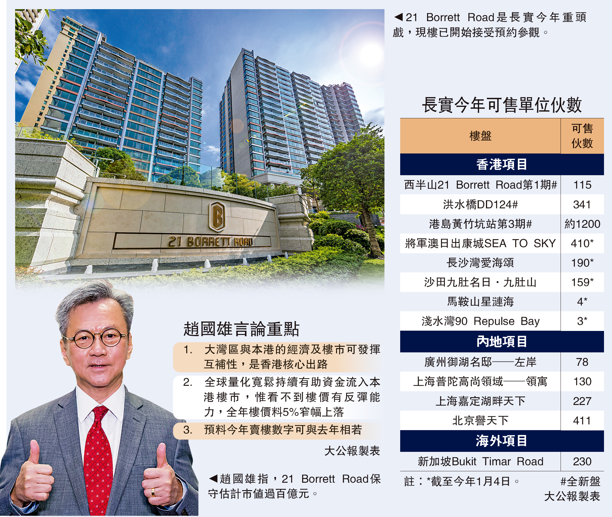 眾發展商受去年疫情打亂推盤部署,今年奮起追數。長實(01113)今年部署3新盤出擊,共涉1656伙,其中打造多時的重頭戲西半山21 Borrett Road第1期,將為集團打頭陣,相信大灣區可發揮互補協調性,有助項目銷售,保守估計市值過百億。預計今年樓價會於5%窄幅上落。