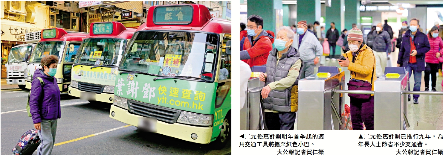 政府推行九年的二元優惠計劃將落實降低門檻,勞工及福利局局長羅致光昨日宣布,明年首季擴至60至64歲「初老」人士可享用,首批約60萬人受惠,適用交通工具擴至紅色小巴(紅Van)、街渡及電車。大公報記者實地觀察發現,現時長者為慳錢,寧願選搭車程時間長近一倍、但車費只需二元的巴士,料未來將紛紛轉乘紅Van。小巴業界估計,人口老化地區的生意會變得活躍。\大公報記者 吳嘉鈴、伍軒沛、胡家俊