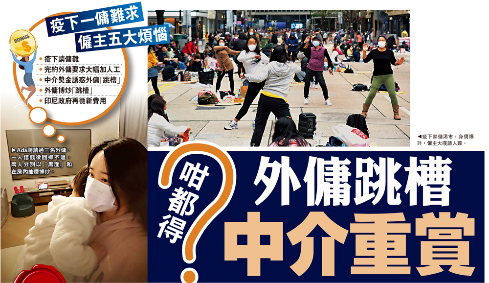 疫下求傭若渴,外傭身價爆升!《大公報》近期連續追蹤報道僱主苦況,調查發現有中介公司竟設現金獎,吸引外傭掛單,完約可獲2000元,斷約仍獲1000元,利誘轉工。