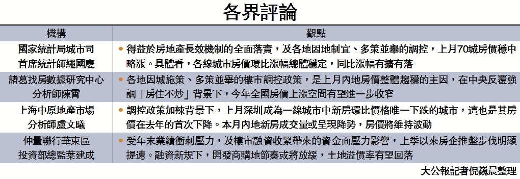 【大公報訊】記者倪巍晨上海報道:國家統計局昨日公布數據顯示,2020年12月70個大中城市新房價格平均漲幅持平於0.12%的前值,當月有42個城市新房價格環比上漲,平均漲幅0.35%,較前值收窄0.04個百分點。其中,揚州新房價格以0.8%的環比漲幅領跑;深圳新房價格環比下降0.1%,為去年首次下降。國家統計局城市司首席統計師繩國慶稱,得益於房地產長效機制的全面落實,及各地因地制宜、多策並舉的調控,上月70城房價穩中略漲。