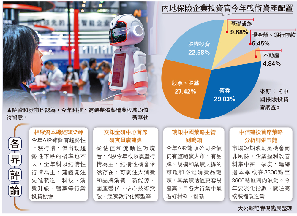 又到保險機構對A股定調中期配置、調整短期戰術之時。有調查顯示,保險投資官對2021年的市場行情態度總體中性偏樂觀,認為機會大於風險。多位券商也表示,從估值和流動性環境看,A股今年雖無持續上漲的「牛市」,但結構性機會仍存在。行業配置上,建議關注科技、消費、醫療健康養老、先進製造業等行業。/大公報記者 倪巍晨