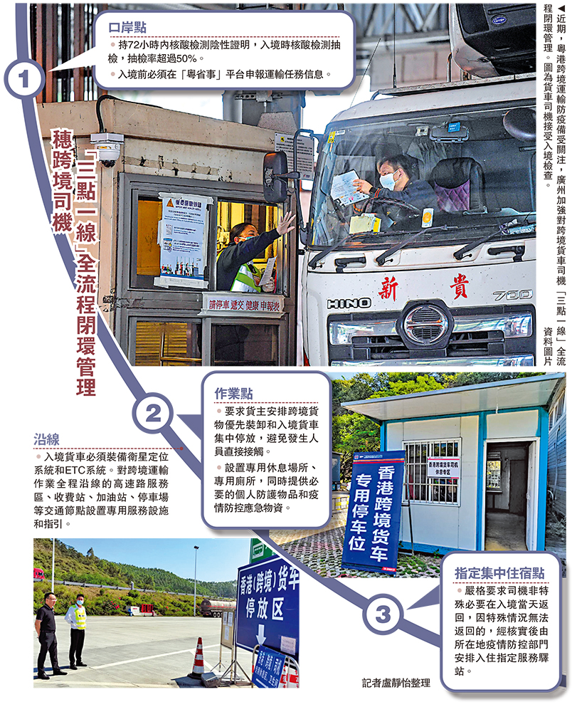 18日,廣州舉行疫情防控專題新聞發布會。此前一名香港跨境司機確診,深圳、東莞出現了零星案例,對於粵港跨境運輸防疫備受關注。廣州市交通運輸局黨組成員、副局長沈穎表示,廣州加強對粵港跨境貨車司機「三點一線」全流程閉環管理,經深圳、珠海口岸入境時口岸會對司機進行核酸檢測抽檢,抽檢率達到50%以上;途經的高速服務區、裝卸作業場所設置專用裝卸區;未能當天返回的安排入住指定服務驛站。\大公報記者 盧靜怡廣州報道