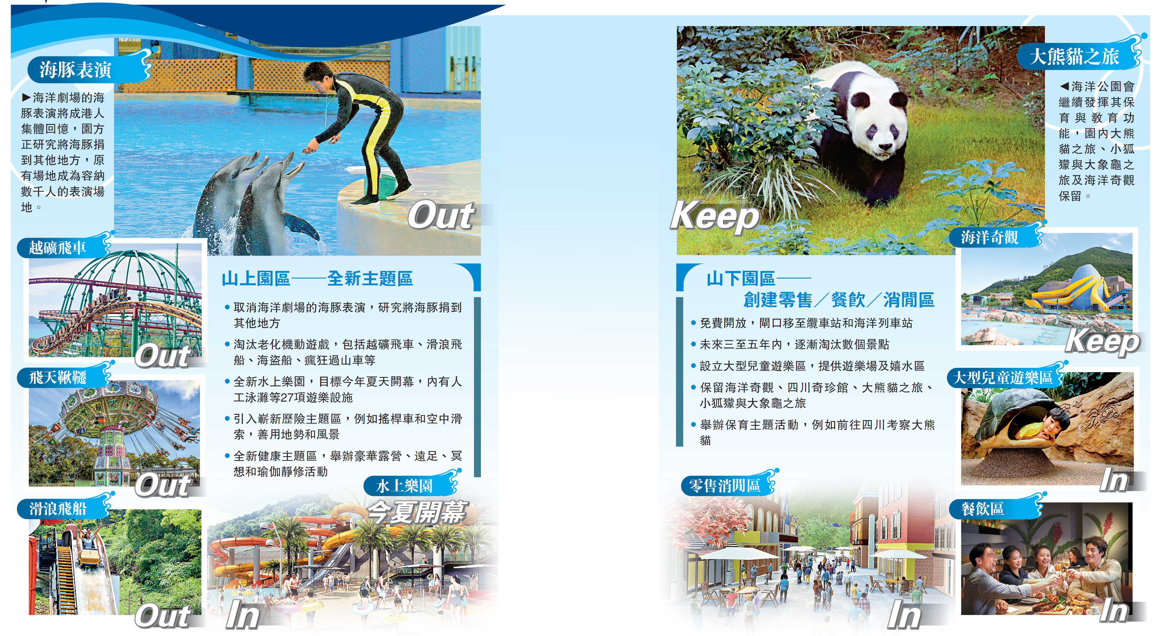 海洋公園推出改革重生方案,不再以「主題公園」形式營運,變身「度假勝地」(resort)。山下園區將免費開放,增設零售、餐飲、消閒區,提供音樂會和文化表演等,山上園區也會大變身,改為景點式逐次或分區收費,拆卸老化的遊樂設施,園內超過一半面積外判予承辦商營運,又會引入空中滑索等歷險主題。政府建議,向海洋公園撥款及延遲償還貸款,合共67.9億元,以支援新方案營運,長遠達至自負盈虧。\大公報記者 馮錫雄