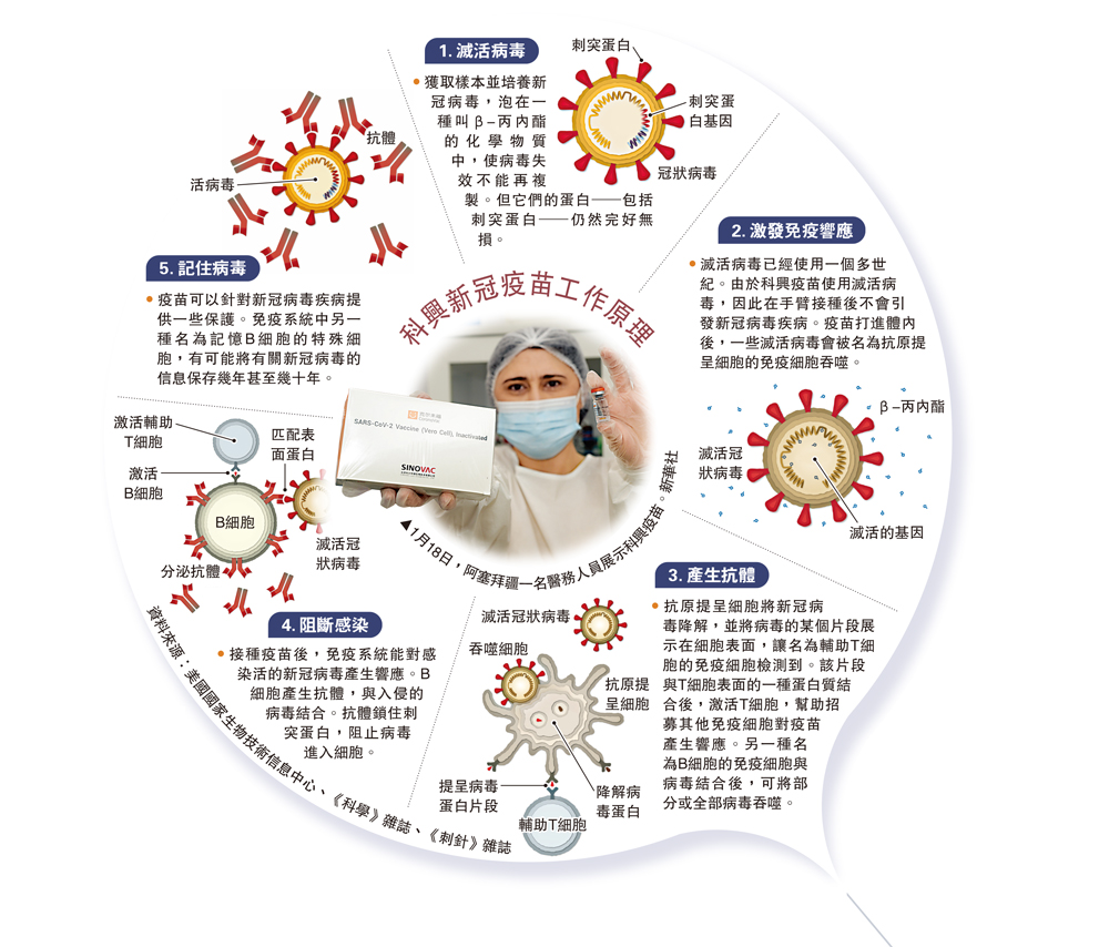 •滅活病毒已經使用一個多世紀。由於科興疫苗使用滅活病毒,因此在手臂接種後不會引發新冠病毒疾病。疫苗打進體內後,一些滅活病毒會被名為抗原提呈細胞的免疫細胞吞噬。
