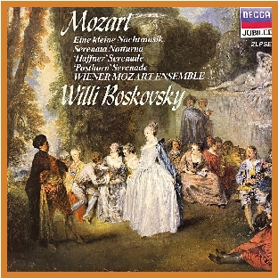 在莫扎特所有譜寫的樂曲中,《G大調弦樂小夜曲》(K.525,又稱《第十三號小夜曲》)不僅是他創作的所有夜曲中最受歡迎的一首,還是其作品中最廣為流傳的曲目之一。在眾多著名的版本中,DECCA唱片公司為慶祝英女王伊莉莎白二世登基二十五年所推出的Jubilee(銀禧)八十年代中價雙碟版,收錄了奧地利指揮家威利.博斯科夫斯基於二十世紀七十年代執棒維也納莫扎特合奏團所錄製的莫扎特夜曲選集可謂頗具代表性兩張唱片。其中不僅包含G大調弦樂小夜曲,還囊括了D大調第六「月下」小夜曲(K.239)、第七「哈夫納」小夜曲(K.250)和D大調第九「郵號」小夜曲(K.320)。這套雙黑膠唱片的封面也是一幅帶有音樂主題的作品,安東.讓.華托所繪的「雅宴畫」代表作《威尼斯節日》。
