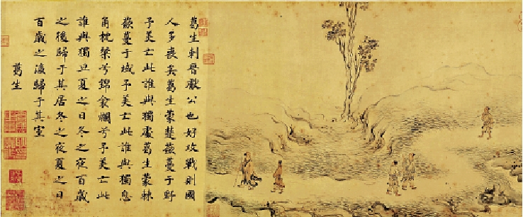 這次展出的《唐風圖》長逾八米,共十二段,取材於《詩經.唐風》中的十二個篇章。書法端謹有致,筆法老勁。繪畫構圖洗練,線條簡潔。據介紹,《唐風》裏所說的「唐」並不是唐朝,而是指西周時期的一個封地,大體在今天的太原南汾水河流域。《詩經》裏的「唐風」就是指採集於此的詩歌。