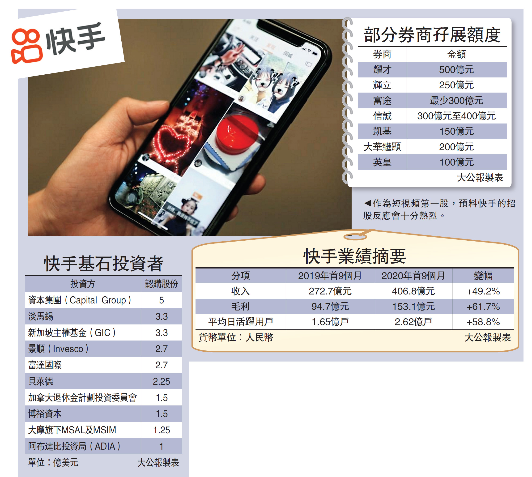 若計及超額配售權,快手集資額將高達483億元,超越了去年的「新股集資王」京東集團(09618),是繼2019年阿里巴巴(09988)上市以來,集資規模最大的新股。目前,騰訊持股逾21%,快手亦將引入10名基礎投資者,包括淡馬錫、新加坡政府投資公司、加拿大退休金計劃投資局,以及阿布扎比投資局等,合共認購24.5億美元(約191億港元)股份,有關投資者承諾股份禁售期為6個月。