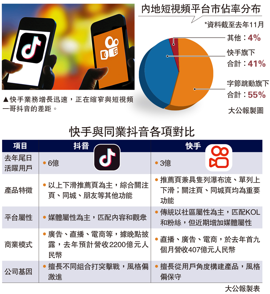 【大公報訊】快手啟動招股,對於其短視頻業務,中金發表報告指出,快手作為短視頻代表平台,去年上半年全平台日活躍用戶(DAU)突破3億,認為短視頻平台兼具媒體和社交屬性,看好視頻化趨勢下,主流平台變現能力的提升。