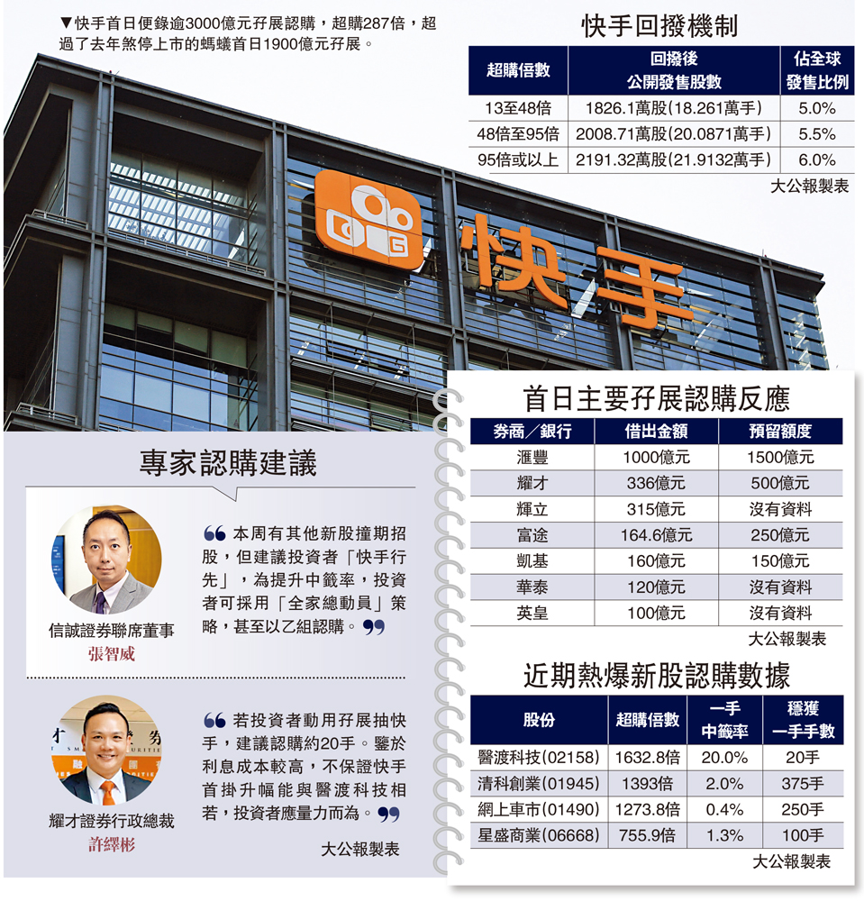 快手科技(01024)正式展開招股,據統計,快手首日便錄逾3000億元孖展認購,超購287倍,超過了去年煞停上市的螞蟻首日1900億元孖展,也超過了「新股凍資王」醫渡科技(02158)首日1040億元孖展,市傳快手將提早於周三結束國際配售。證券業人士表示,回撥後亦只有22萬手分配予散戶,估計最終要抽400手才穩獲1手。\大公報記者 吳榕清