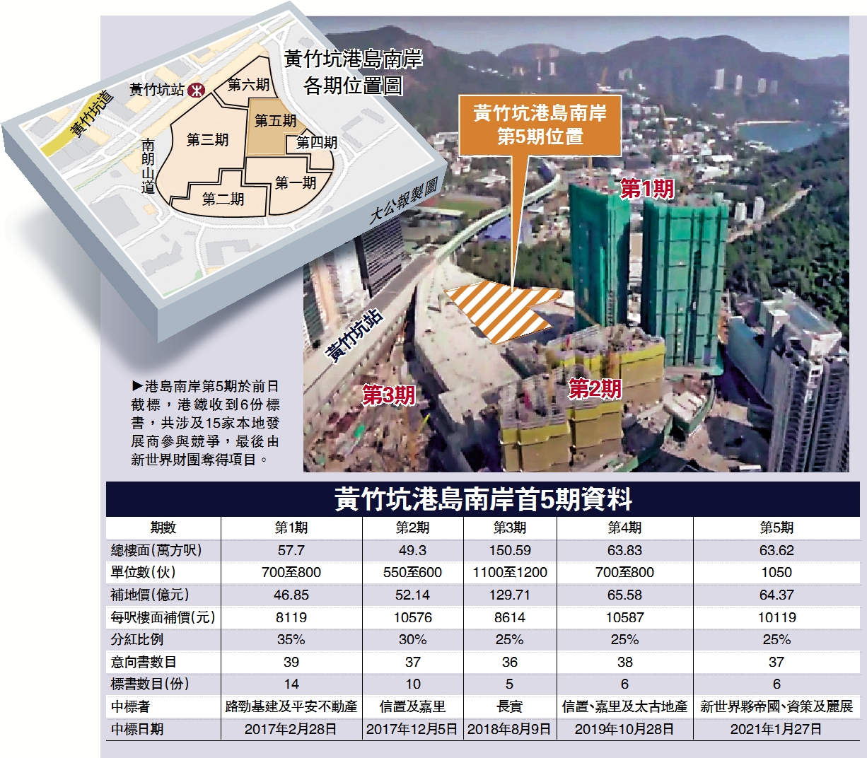 港島南岸第5期於前日截標,港鐵收到6份標書,共涉及15家本地發展商參與競爭,當中12家更分組3合資財團爭奪。港鐵昨迅速公布,該期的發展合約由新世界、帝國集團、資本策略(00497)及麗新發展(00488)所組的健昕有限公司投得。該組合中,新世界及資策之前已各有參與發展馬鐵大圍站上蓋商住項目,及油塘站通風樓住宅項目發展。
