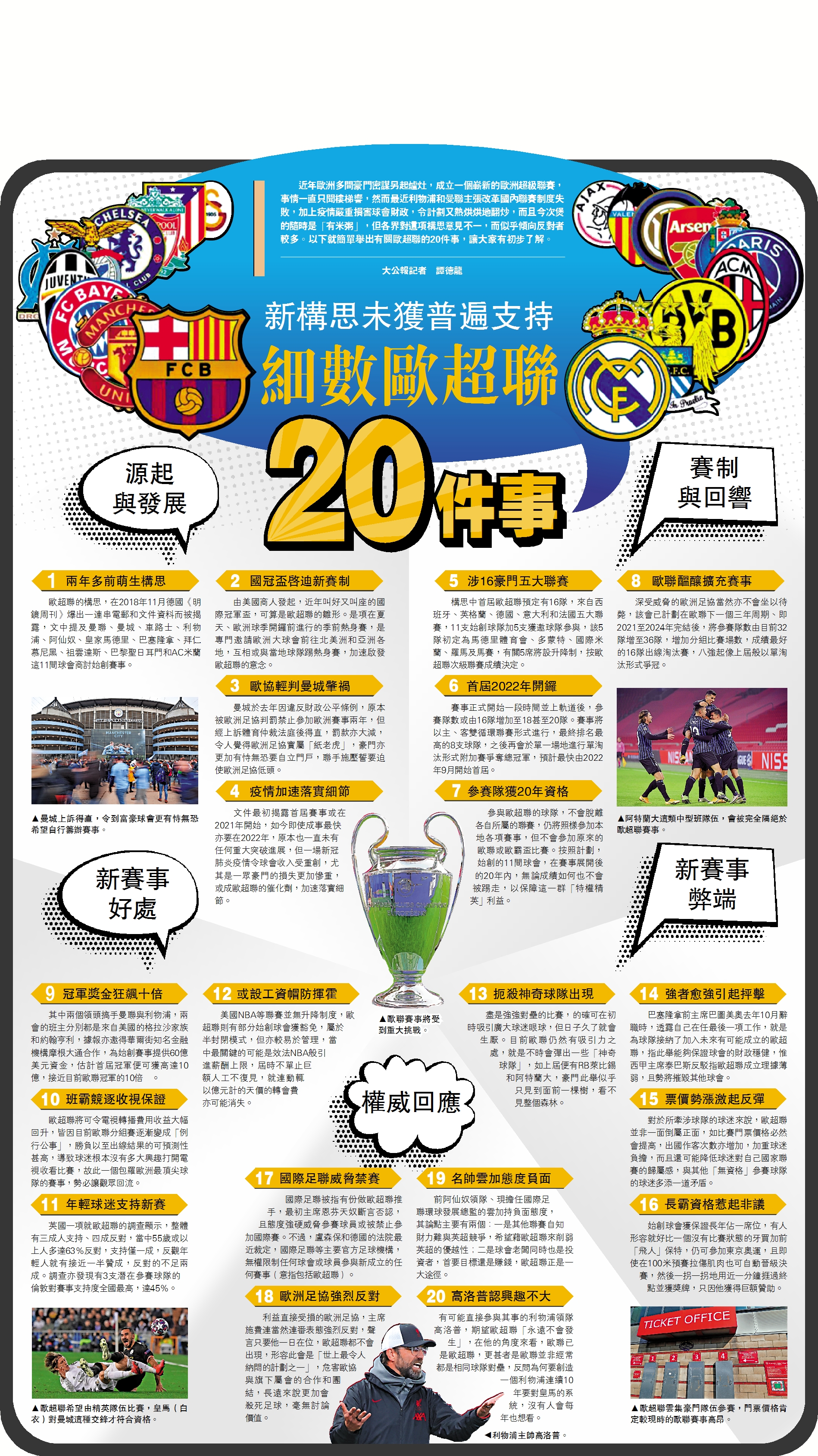 近年歐洲多間豪門密謀另起爐灶,成立一個嶄新的歐洲超級聯賽,事情一直只聞樓梯響,然而最近利物浦和曼聯主張改革國內聯賽制度失敗,加上疫情嚴重損害球會財政,令計劃又熱烘烘地翻炒,而且今次煲的隨時是「有米粥」,但各界對這項構思意見不一,而似乎傾向反對者較多。以下就簡單舉出有關歐超聯的20件事,讓大家有初步了解。\大公報記者 譚德龍