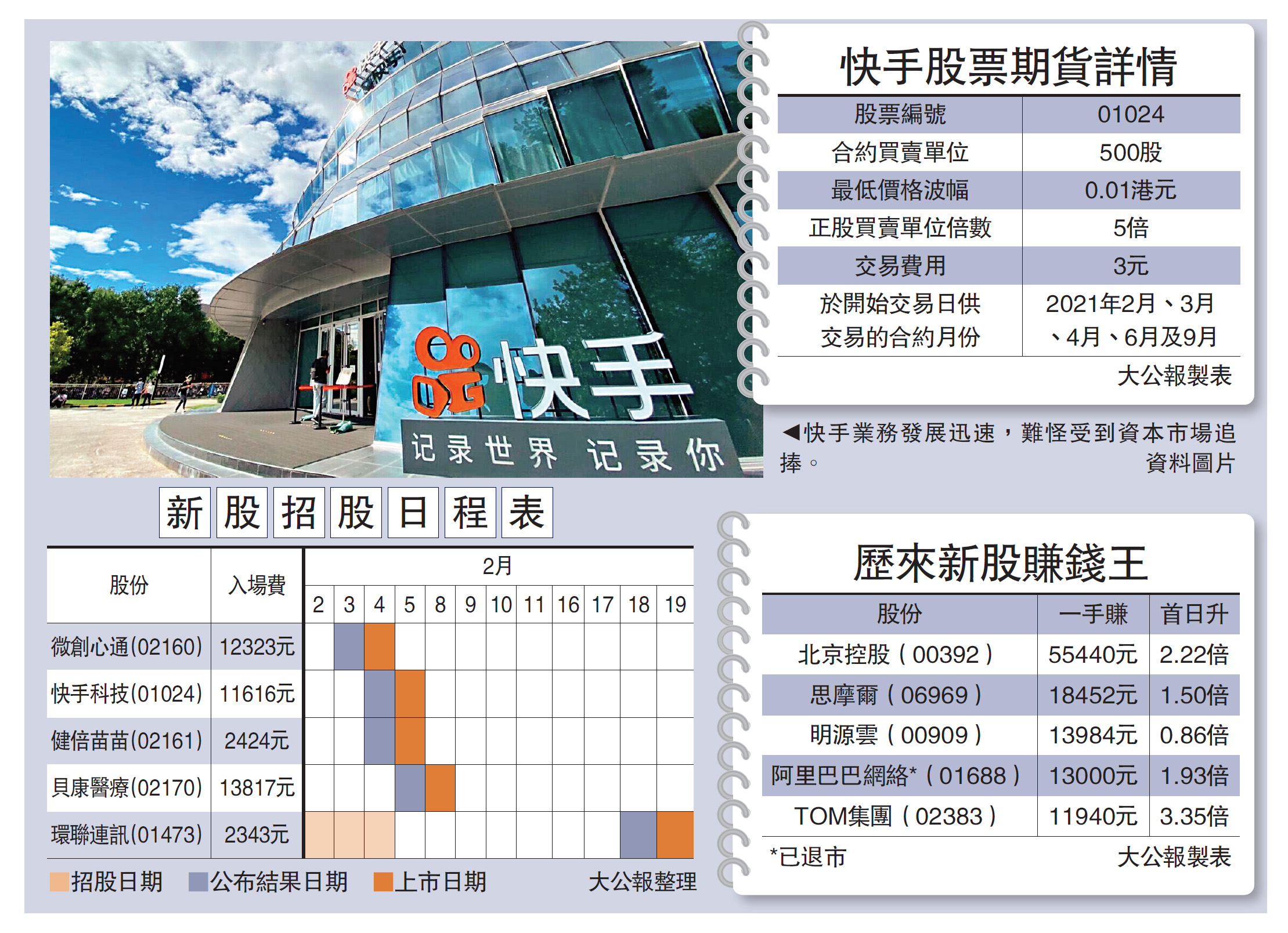 將於周五掛牌的快手科技(01024)已有場外交易,成交價達250元較招股價上限115元高逾一倍。信誠證券聯席董事張智威認為,250元的成交價屬意料之內,因為據聞是次快手分貨極少,就算以乙組認購也未必可中一手,股價自然「炒到飛天」,以至於就算首掛股價升超過250元也不足為奇。此外,港交所發通告指,若快手成功上市相關股票期貨期權將在2月5日同步推出。
