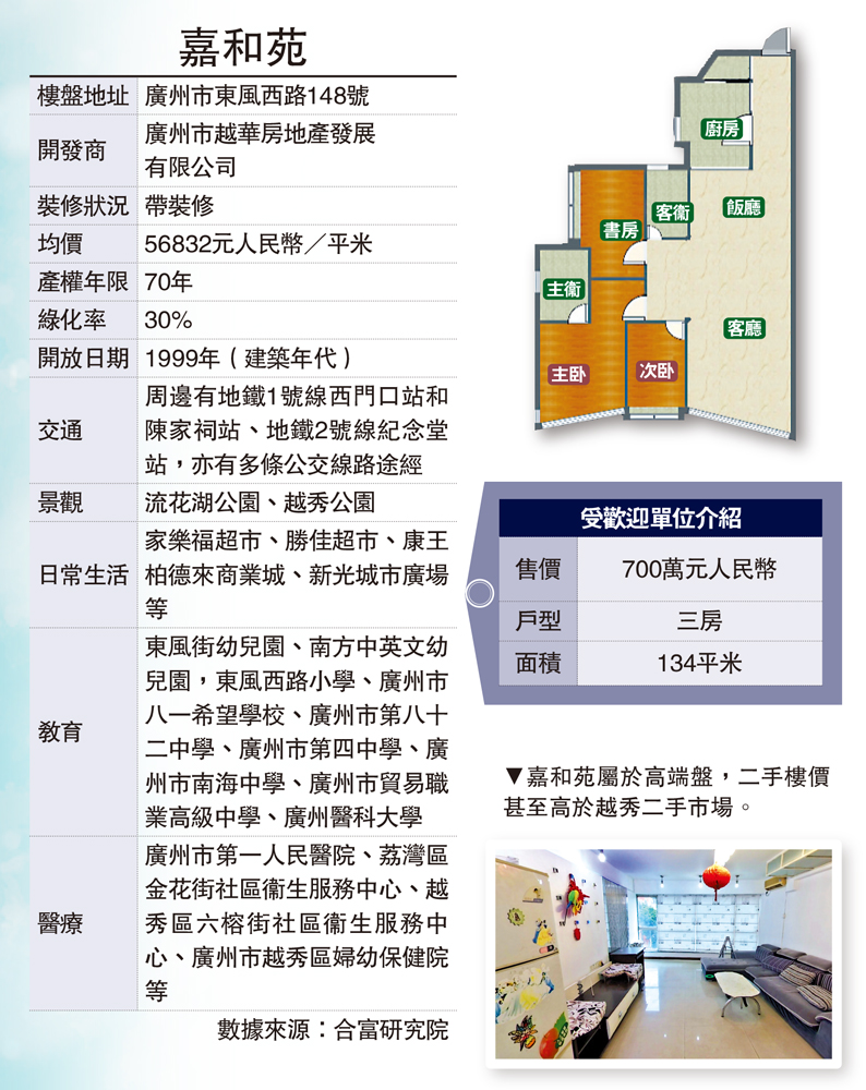 嘉和苑坐落於廣州市中心旺地東風西路,地理位置優越,廣州市政府、廣州國際金融大廈等政治、經濟標誌建築物圍繞在旁,附近有中國大酒店、東方賓館、中國進出口商品交易會流花展館。中介告訴記者,由於嘉和苑屬於高端盤,二手樓價高於越秀二手市場。