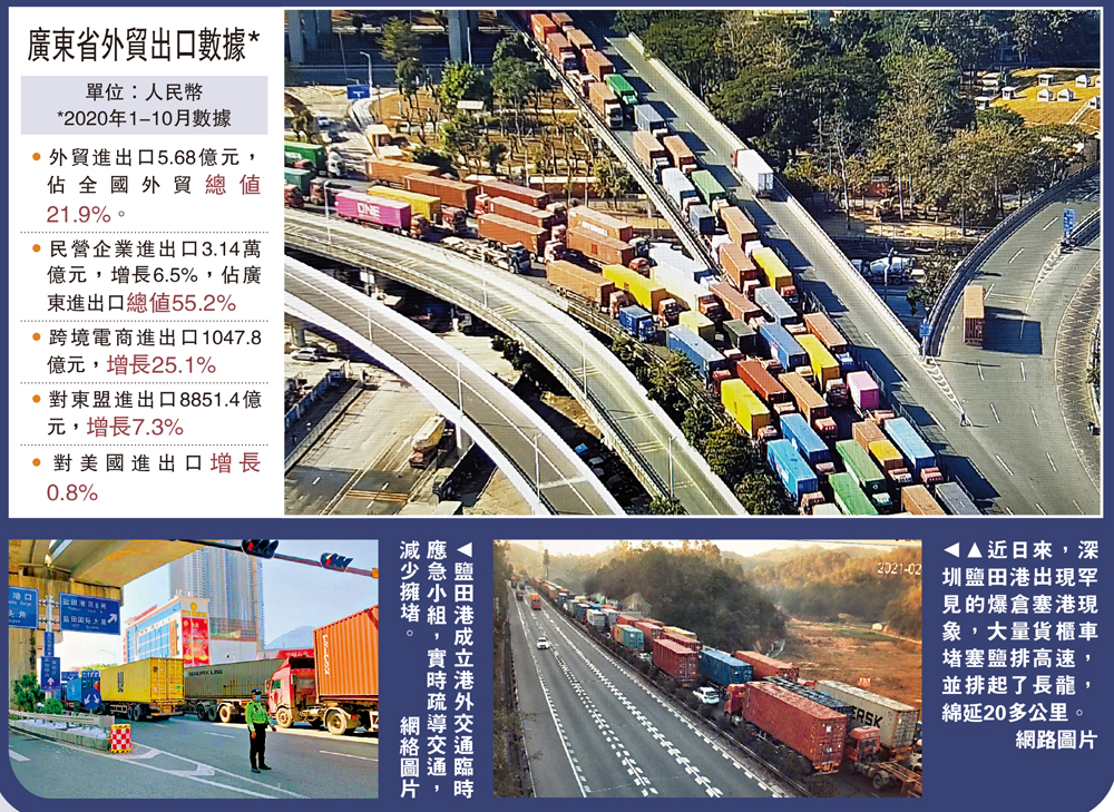 春節前,深圳鹽田港作業量大幅上升。7日,鹽田港附近的貨櫃車綿延20多公里,甚至塞到了鹽排高速上。據大公報記者了解,這是由於歐美疫情未受控,物資需求量大,珠三角地區大量工廠趕在年前交貨,導致鹽田國際碼頭作業量大幅上升所致。隨着中國外貿出口穩步復甦,鹽田港集裝箱一度「一櫃難求」。據統計,2020年鹽田港集裝箱吞吐量達1334.85萬標箱,同比去年逆勢增長2.1%,新增航線11條。\大公報記者 李昌鴻深圳報道