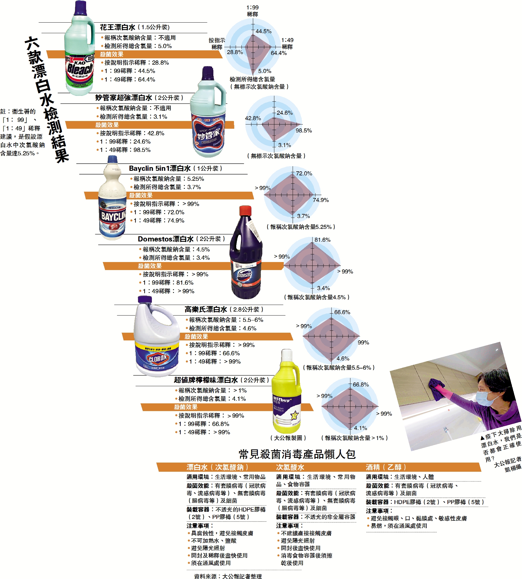 《大公報》隨機抽樣市面上六款漂白水進行測試,發現一半樣本的有效成分低於包裝聲稱含量,兩款產品即使跟足說明指示稀釋使用,亦達不到聲稱的殺菌效果;若以衞生防護中心經常在宣傳中提及「1:99」稀釋使用,更是所有樣本的殺菌效果均未如理想,有產品的殺菌率甚至不足25%。