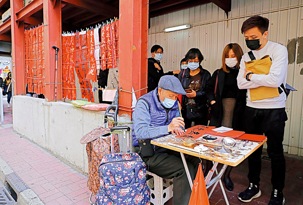在小小寫字檔築起的揮春紅牆旁,陳伯即席揮毫,途人精心挑選,共同的期許是:疫情盡快平復!\大公報記者 李亞清(文) 賀仁(圖)