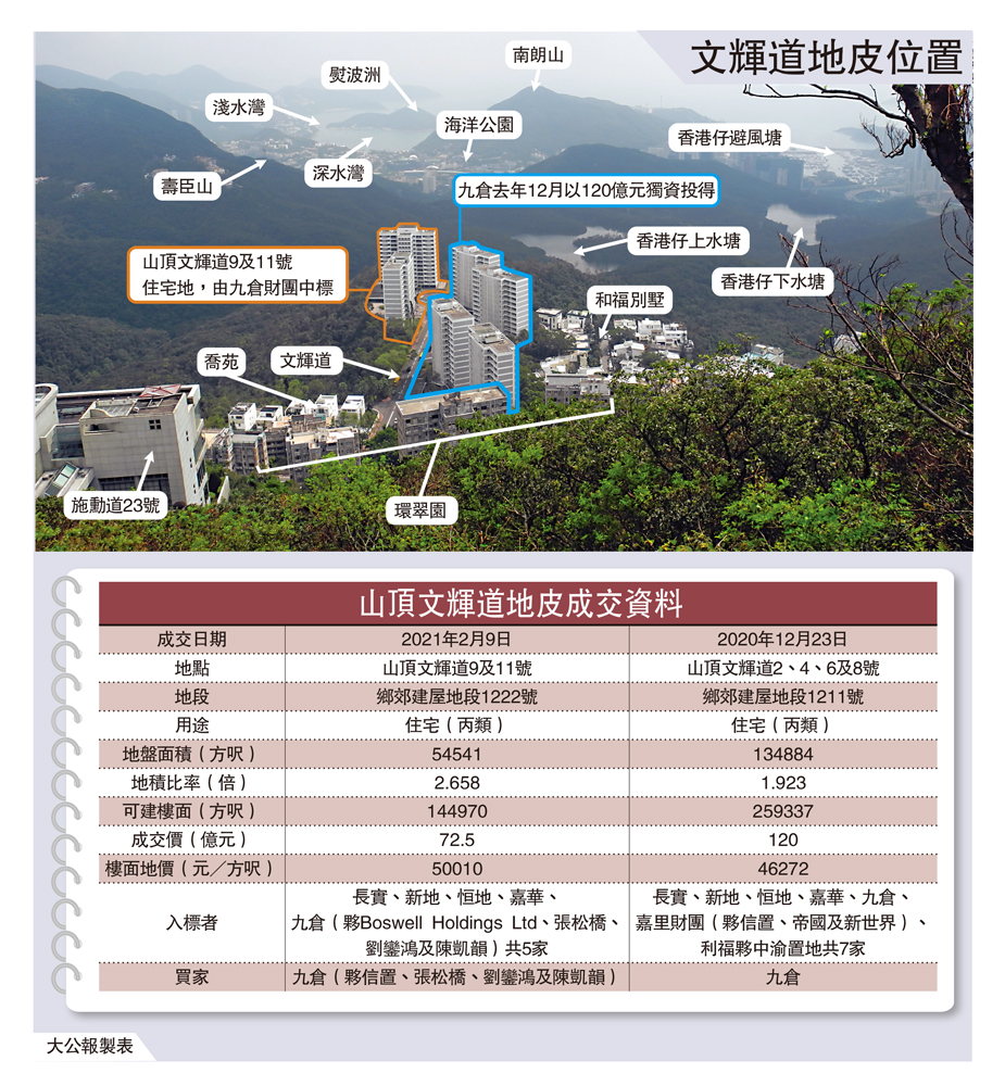 九倉(00004)繼去年底獨資以創高價投得山頂文輝道豪宅地後,剛夥多位城中富豪合組財團,以再創新高價摘下毗鄰另一幅文輝道地,每呎樓面地價升破5萬元。業界認為,這反映出部分發展商對豪宅後市有信心,預計項目落成後,每呎賣價需要約10萬元,才有合理利潤。
