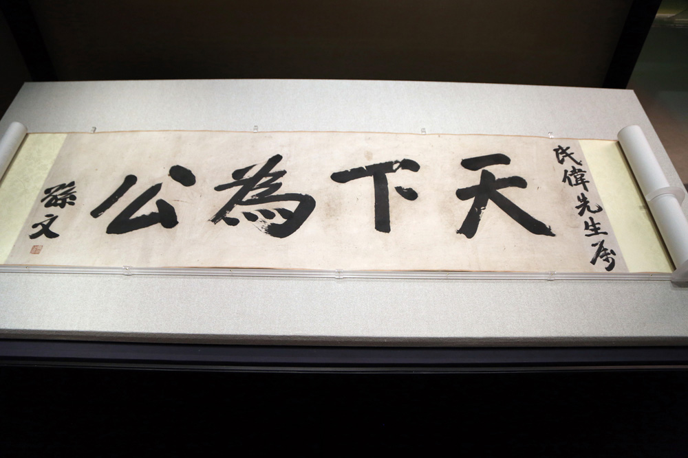 「天下為公」作品高37.8厘米、長127.4厘米。據介紹,孫中山生平喜歡書寫「天下為公」贈人,南院展出的墨寶為題贈黎民偉,並作為當時攝製新聞紀錄片所用。黎民偉被稱為「香港電影之父」,是中國電影的早期開拓者之一。此墨寶為黎民偉之女黎蘭贈與故宮。
