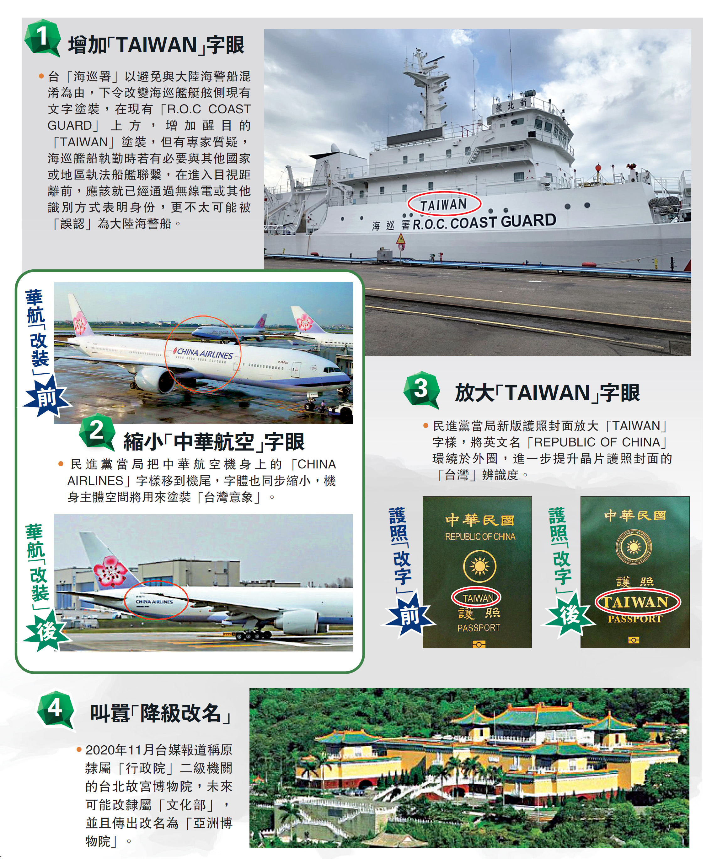據台媒報道,在民進黨當局領導人蔡英文的指示下,台灣「海巡署」以避免與大陸海警船混淆為由,下令改變海巡艦艇舷側現有文字塗裝,增加「TAIWAN」塗裝,未來逾百艘大小艦艇,將利用歲修時機,全數「正名」。中國國民黨立委質疑此舉可能有意識形態的考量;軍事專家則指「海巡署」多此一舉。自蔡政府上台後,沿襲陳水扁時代「去中國化」的「正名」行徑,受到島內輿論嚴厲批評。