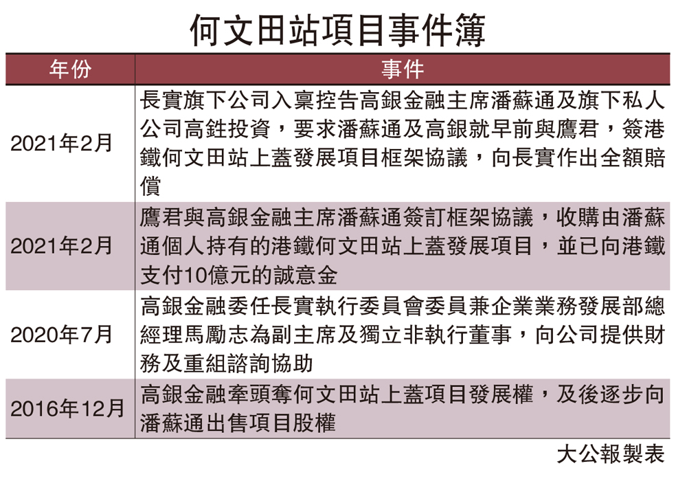 【大公報訊】長實集團(01113)旗下公司,入稟控告高銀金融(00530)主席潘蘇通及旗下私人公司高鉎投資。根據入稟狀,長實要求潘蘇通及高銀就早前與鷹君(00041)簽訂港鐵(00066)何文田站上蓋發展項目訂立框架協議,向長實作出全額賠償。長實表示,「相信事情是一個誤會,只想提示對方信守協議,事件應能在未來數天得到解決,待事情解決,傳票將被撤回。」