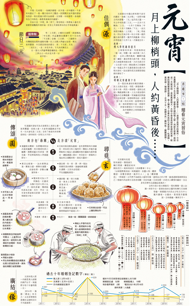 「月上柳梢頭,人約黃昏後……」浪漫不是西方的專利,今日是農曆正月十五元宵節,被譽為中國的情人節,而新年節慶一般到這一天就完結。是夜萬家燈火,大街小巷皆是結伴夜遊的民眾,歌樂的喧鬧聲徹夜迴盪。港人傳承了中華民族的元宵習俗,吃湯圓、賞花燈、猜燈謎……正月十五,祝願市民一團和氣,團團圓圓!