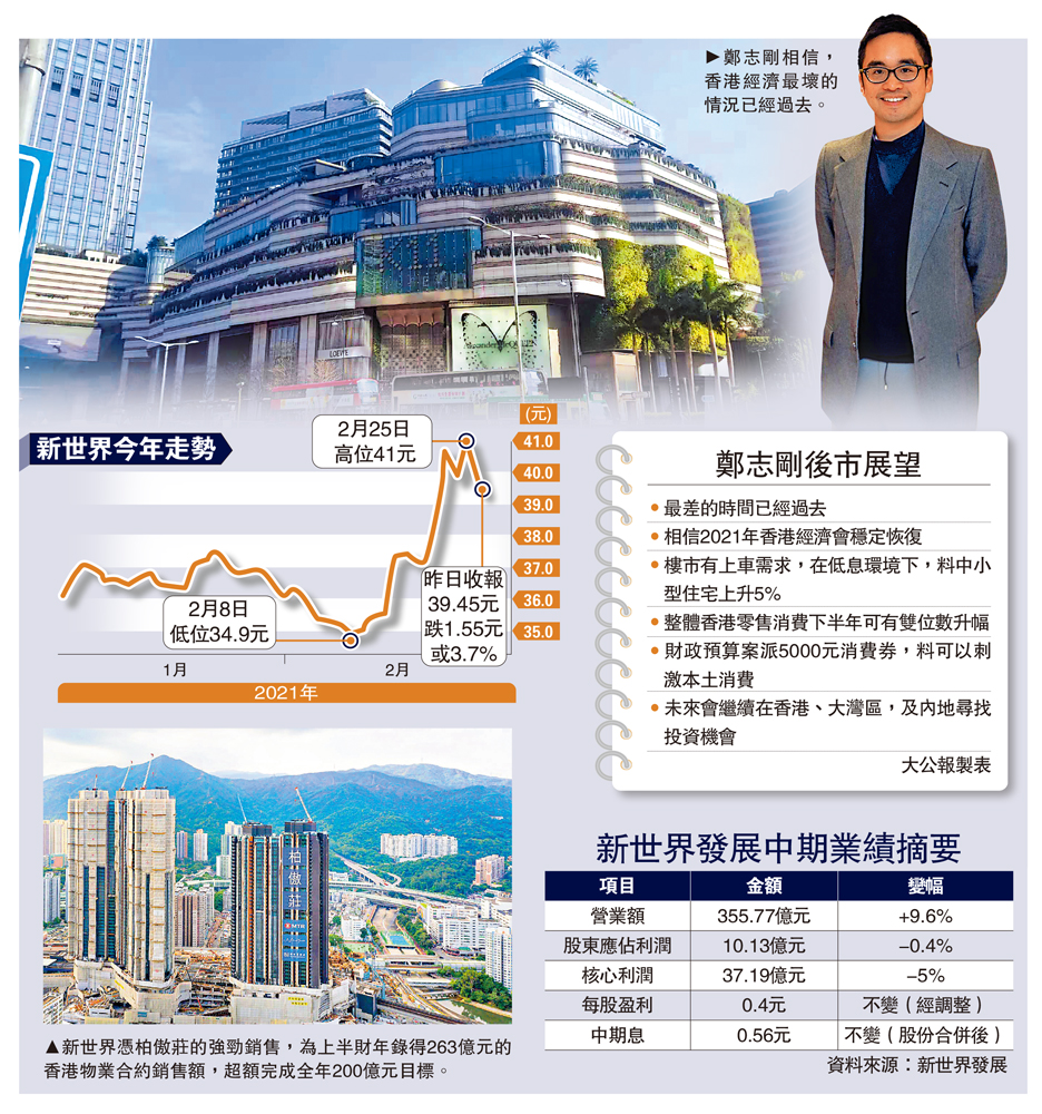 新世界昨公布中期業績,截至去年底,營業額上升9.6%,至355.77億元,股東應佔利潤為10.13億元,按年微跌0.4%;撇除投資物業重估,核心利潤跌5%,至37.19億元;派中期股息每股0.56元,並維持現有可持續及漸進式派息政策。