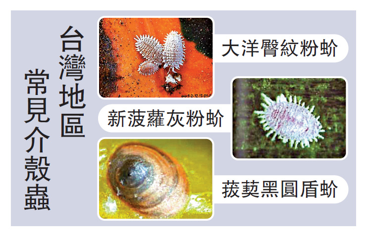大洋臀紋粉蚧、新菠蘿灰粉蚧、菝葜黑圓盾蚧(統稱「介殼蟲」)在台灣是常見害蟲,包括鳳梨、釋迦、荔枝都是常見寄主,終生寄居在枝葉或果實上,會導致果樹葉片發黃、枝梢枯萎、樹勢衰退,且易誘發煤煙病。