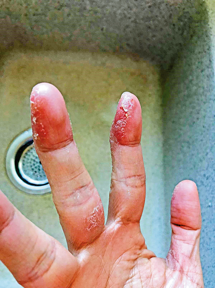 該女士時有皮膚敏感,以前因愛吃沒有戒口,如今戒口卻又因疫情下要勤洗手,同時多了使用消毒酒精用品,導致雙手嚴重敏感,出現乾燥和龜裂,甚至影響手指活動功能。