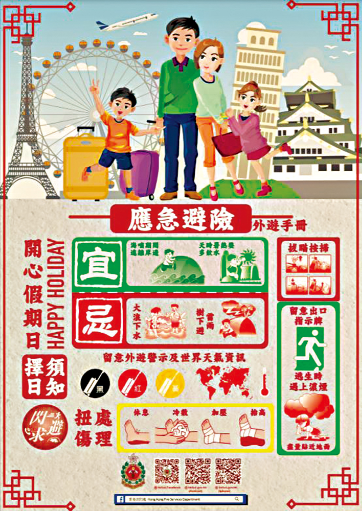 市民亦可下載消防處推出的電子版《應急避險外遊手冊》,輕鬆學習多種應對緊急事故的方案,加強應急自救能力。另外,消防處呼籲所有行山人士緊記,出發遠足前應小心計劃行程,結伴同行,切勿單獨行動,如有兒童同行,應選擇一些相對難度較低的路線如家樂徑、樹木研習徑等,並帶備充足裝備和留意天氣變化,也不應亂闖密林和山澗,更不可靠近懸崖邊緣或嘗試攀爬峭壁,以免發生意外。