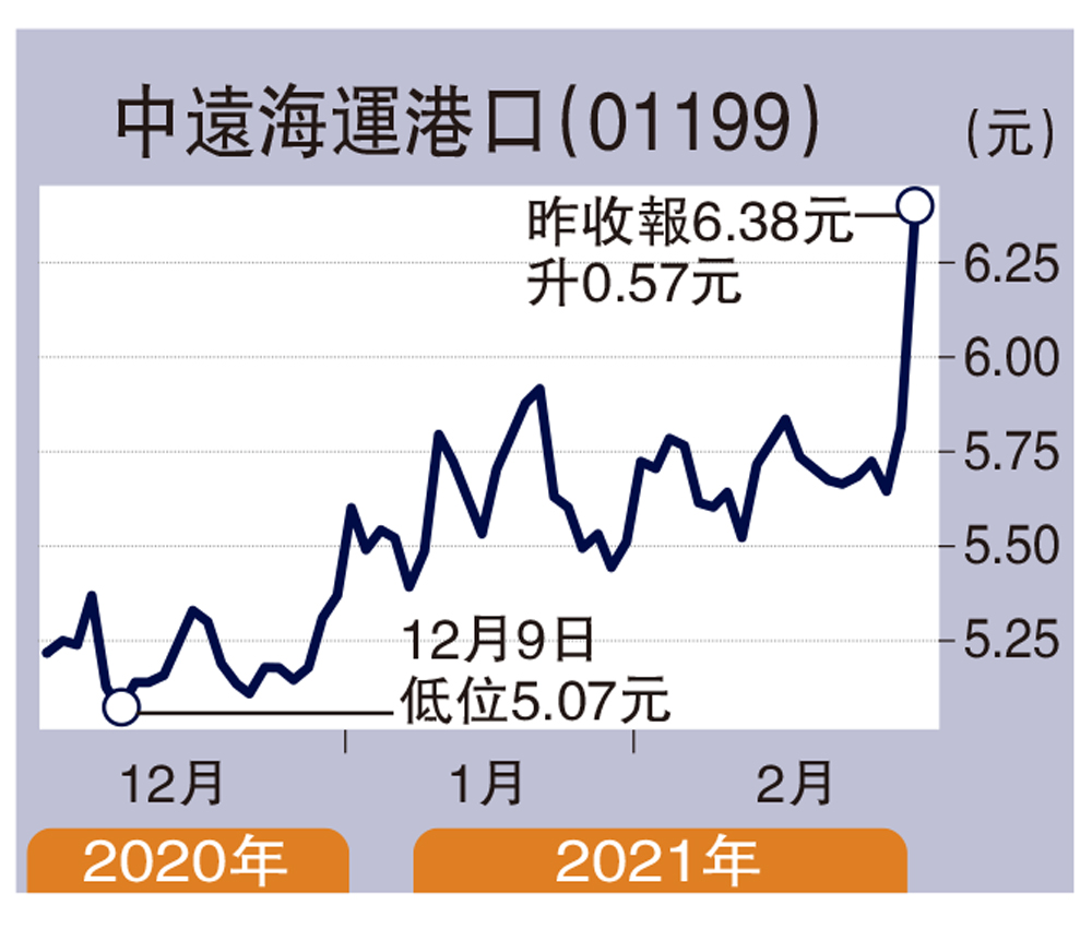若論威風,還是中遠海運港口(01199),日前宣布以十三億元人民幣增持天津集裝箱碼頭股權至五成一,又透露今年一月中遠吞吐量增百分之二點七,不久前更斥資一點四億美元收購沙特碼頭運營商二成股份,一連串動作,顯示擴展步伐加速,運營效率提升,所以成為基金吸納的新對象。昨日升勢凌厲,收六元三角八仙,漲百分之九點八,成為跌市奇葩。
