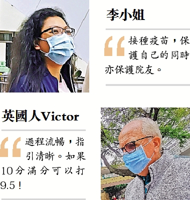 來自英國的Victor屬長者優先組別,他昨日攜太太一起往接種疫苗。他說家庭醫生建議接種,對於有人打針後離世,他說,「那位長者有高血壓、高血脂,又有糖尿病,是自身情況問題。我十分清楚自己的身體健康,也清楚疫苗的副作用,所以毫不擔心。」他認為所有疫苗都可能有副作用,相比較下,沒有疫苗保護,更令人擔心。