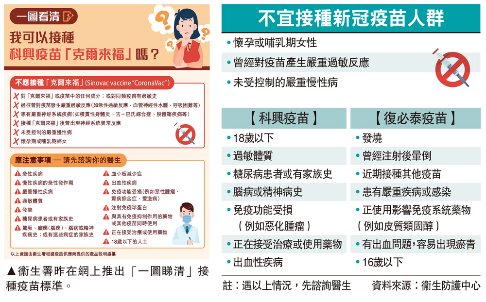 衞生防護中心昨日在網上推出的「一圖睇清」資訊,羅列不宜接種疫苗標準(詳見圖),呼籲市民若出現這些情況先諮詢醫生。據了解,政府最快今日發出新冠疫苗注射新指引,供醫護及市民參考。