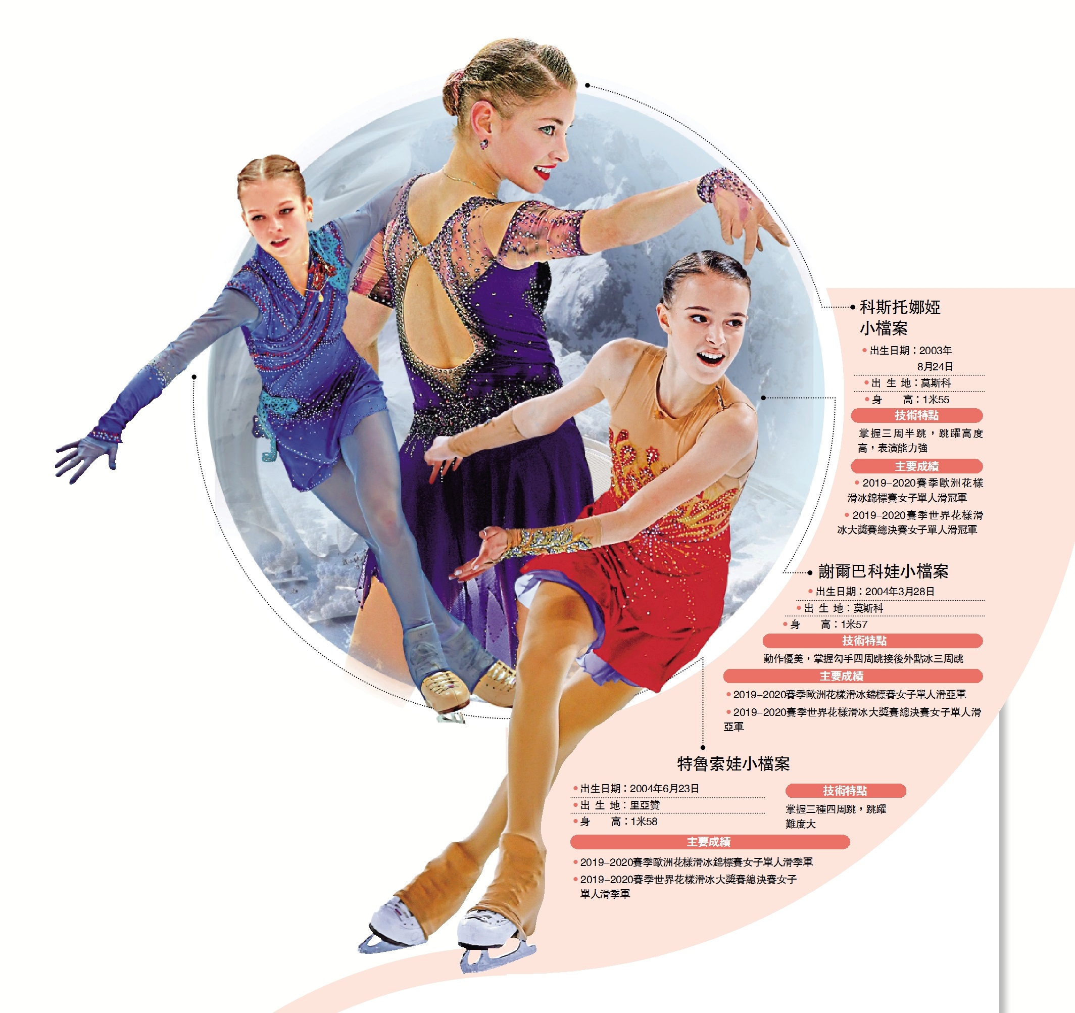 平昌冬奧後,原以為奧運冠軍扎吉托娃將稱霸世界女子花滑界,但出人意料的是,隨着科斯托娜婭、謝爾巴科娃、特魯索娃3位當時不滿16歲的小將升入成年組,扎吉托娃在全國比賽中已經很難進入前三名。2019-2020賽季的世界花滑大獎賽上,3位俄羅斯小蘿莉包攬6站分站賽的冠軍,以及總決賽的前三,成為北京冬奧上的奪金熱門人選。