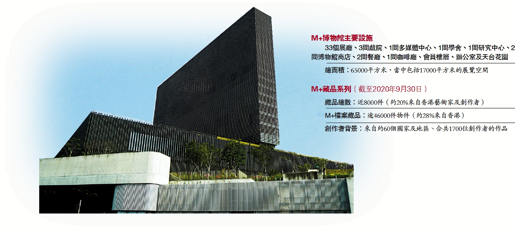 國家「十四五」規劃中提到支持香港發展中外文化藝術交流中心。佔地40公頃的西九文化區正發展成為香港文化新地標,其中M+博物館和香港故宮文化博物館將於未來兩年相繼落成啟用。西九文化區管理局昨日宣布,M+博物館大樓的建築工程完成,將於今年底開幕,屆時將會是全球最新的文化建築地標,亦是亞洲首間全球當代視覺文化博物館,致力於收藏、展示現當代視覺藝術、設計、建築、流動影像以及香港視覺文化。/大公報記者 李亞清