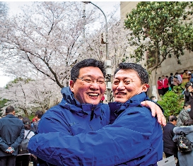【大公報訊】記者俞鯤武漢報道:雷神山醫院副院長、大連醫科大學附屬第一醫院副院長尚東13日與雷神山醫院副院長、武漢大學中南醫院副院長袁玉峰同遊櫻花大道。同年出生,同年加入中國共產黨,同為外科醫生,加入同一個戰場──雷神山醫院,袁玉峰和尚東並肩作戰52天,捨生忘死抗擊新冠疫情。